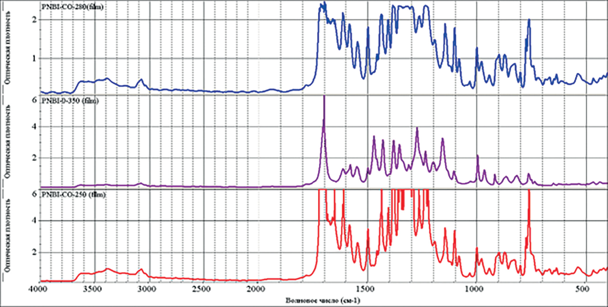 Как видно из рис. 3, как в ПНБИ-СО (250), так и в ПНБИ-СО (280) очевидно присутствие недоциклизованных звеньев, тогда как ПНБИ-О (350) их не содержит. Схожая картина с наличием полос, характерных для недоциклизованных структур, наблюдается и для образцов ПНБИ-SO2 (280), в то время как для ПНБИ-SO2 (320) полосы, характерные для недоциклизованных структур, практически отсутствуют. При этом, в отличие от ПНБИ-СО, термообработка ПАНИ-SO2 при 320оС позволяет получать пленки с хорошими механическими свойствами.