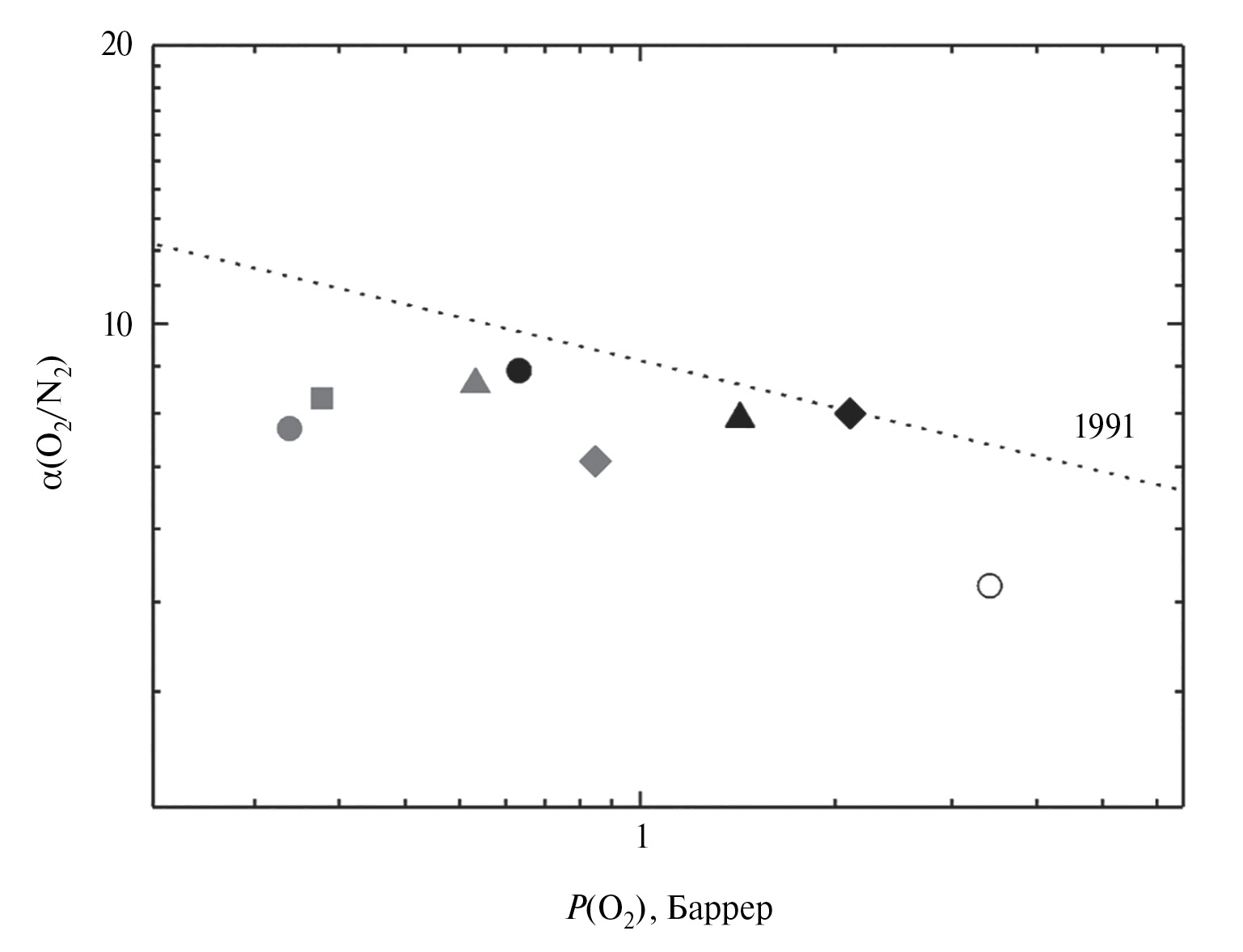 Рис. 4. Фрагмент диаграммы Робсона 1991 г. [8] для пары газов кислород – азот. Круги: белый – ПАНИ-О, серый – не полностью циклизованный ПНБИ-О [7], черный – полностью циклизованный ПНБИ-О [6]. Ромбы: серый – не полностью циклизованный ПНБИ-σ [7], черный – полностью циклизованный ПНБИ-σ [6]. Квадрат – ПНБИ-СО (250). Треугольники: серый – ПНБИ-SO2 (280), черный – ПНБИ-SO2 (320) полностью циклизованный.