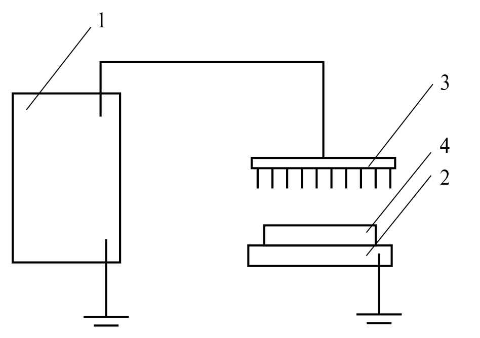 Рис. 1. Схема коронатора: 1 – источник высокого напряжения, 2 – заземленный электрод, 3 – коронирующий электрод, 4 – образец мембраны.