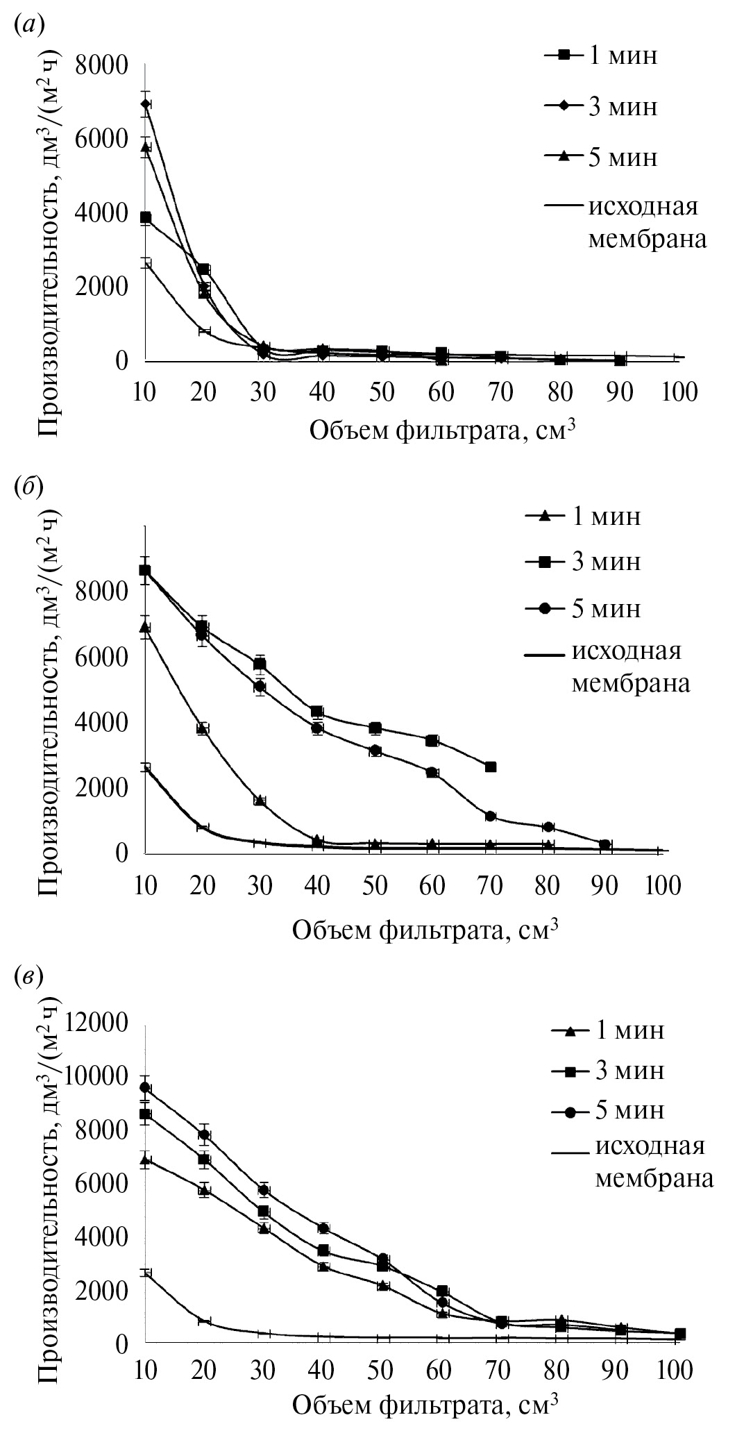 Рис. 2. Производительность разделения нефтяной эмульсии ПА мембранами, обработанными коронным разрядом при: а) U = 5 кВ; б) U = 15 кВ; в) U = 25 кВ.