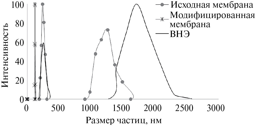 По полученным гистограммам (рис. 3) показано, что обработанная коронным разрядом мембрана пропускает более мелкие частицы нефти вследствие образования на поверхности нового селективного слоя, повышающего эффективность процесса, но за счет малой толщины не снижающего производительность.