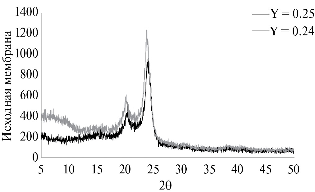 При анализе дифрактограмм степени кристалличности исследуемых ПА мембран в результате воздействия коронного разряда существенных изменений не обнаружено. Значение рассматриваемого параметра составило γ = 0.25 и γ = 0.24 для исходного и коронообработанного образцов мембран соответственно.