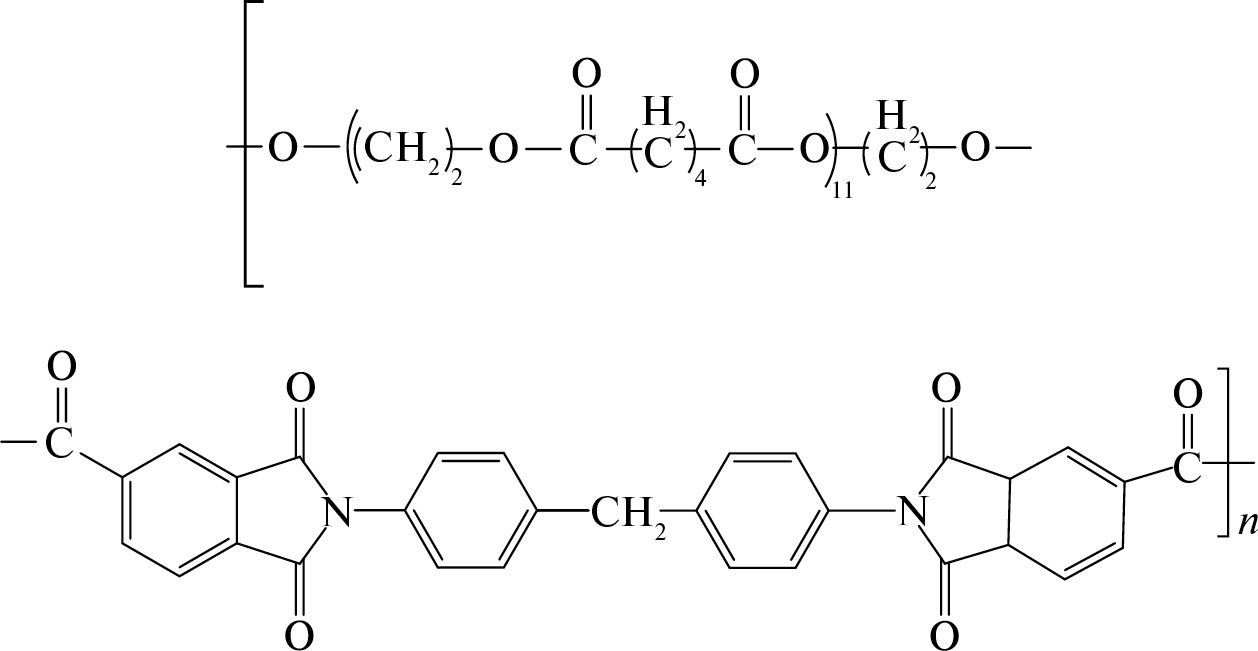 По своему строению (архитектуре) мультиблочным (сегментным) сополи(уретан-имидам) соответствует общая формула [А – (В)k]n. В каждом повторяющемся звене этих сополимеров содержится жесткий блок мономера А (ароматического имида, обрамленного уретановыми группами) и гибкий блок (В)k алифатического полиэфира, входящего в полиуретан. Как отмечалось, блоки А и (В)k термодинамически плохо совместимы и образуют в объеме сополимера микрофазы. В общем свойства сополи(уретан-имидов) опредеделяются комбинацией гибкости цепей полиэфирных сегментов, жесткости (уретан-имидных) сегментов, разделением и частичным взаимопроникновением фаз, водородными связями, π-π-взаимодействиями бензольных колец и другими межмолекулярными взаимодействиями. Требуется пояснить, что полиуретаны получают при взаимодействии алифатических полидиолов (т.е. простых или сложных полиэфиров, имеющих концевые гидроксильные группы) с ароматическими диизоцианатами. Детальные прописи синтеза сегментных поли(уретан-имидов) приводятся в работах [18, 19].