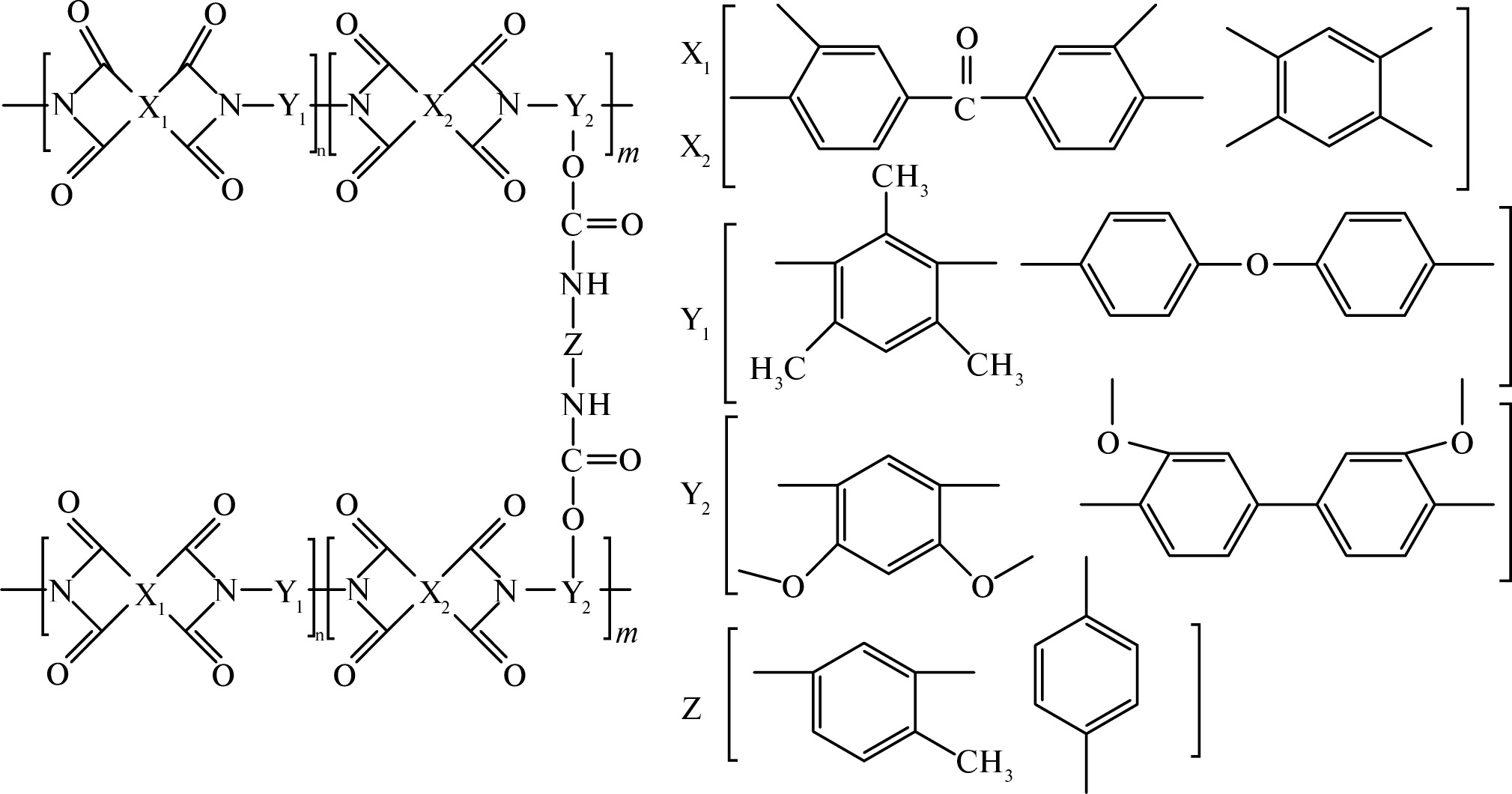 В патенте [35] приводится способ синтеза сшитого поли(имид-уретана), полученного на основе диангидрида 2,2`-бис(3,4-дикарбоксифенил)гексафторпропана и 3,3`-дигидрокси-4,4`-диаминобифенила и сшитого с помощью 2,4-толуилендиизоцианата. Мембраны для испытаний в виде непористых пленок приготовляли при использовании образцов полимеров, полученных при мольном соотношении гидроксильных и изоцианатных групп 5/4 и 4/1 соответственно. Ниже приводится формула, отражающая химическое строение узлов сшивки полимеров (структуры радикалов представлены выборочно):