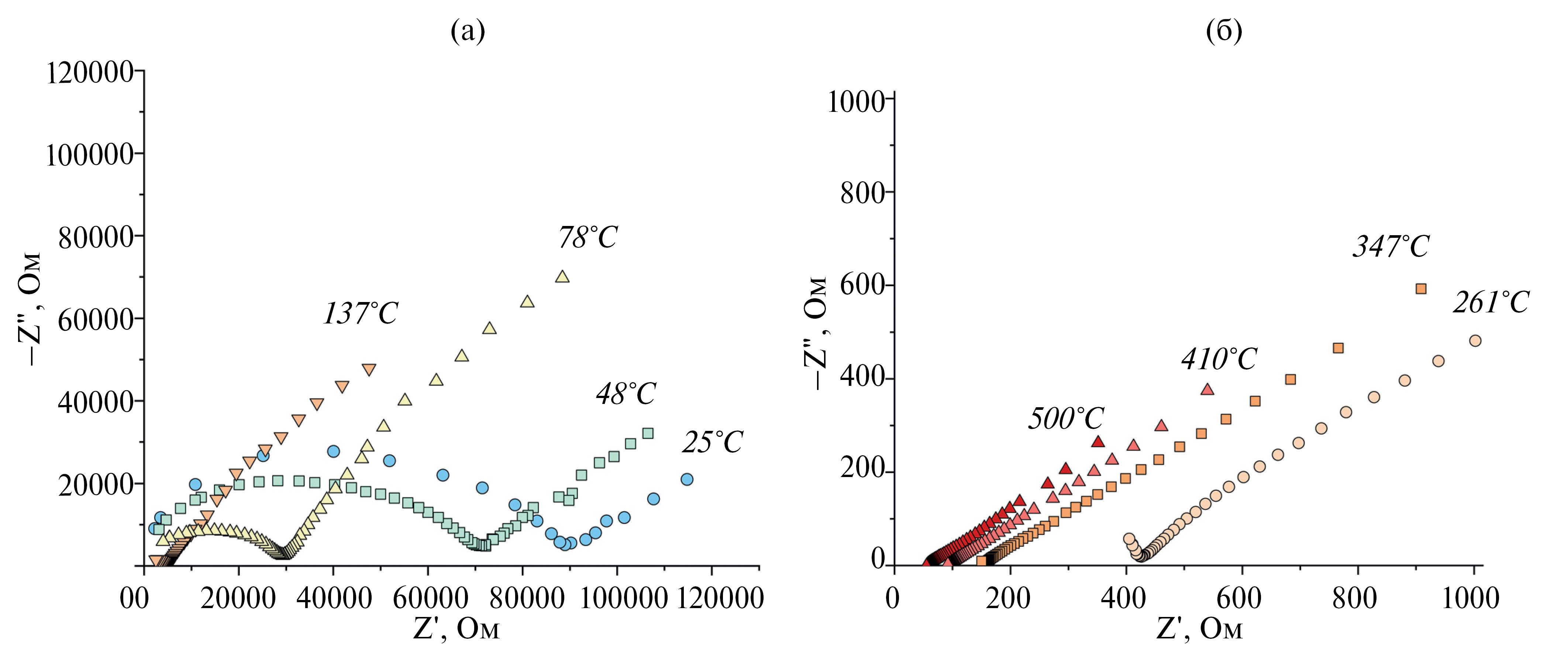Годографы импеданса при комнатной температуре представляет собой комбинацию полуокружности, выходящей из начала координат и прямой линии (рис. 2а). При нагревании полуокружность постепенно исчезает и годографы принимают форму “галочки”, а затем представляет собой прямые линии (рис. 2б). При более низких температурах величину проводимости рассчитывали экстраполяцией полуокружности объемной составляющей проводимости, а при более высоких температурах- по отсечке прямой на оси активных сопротивлений.