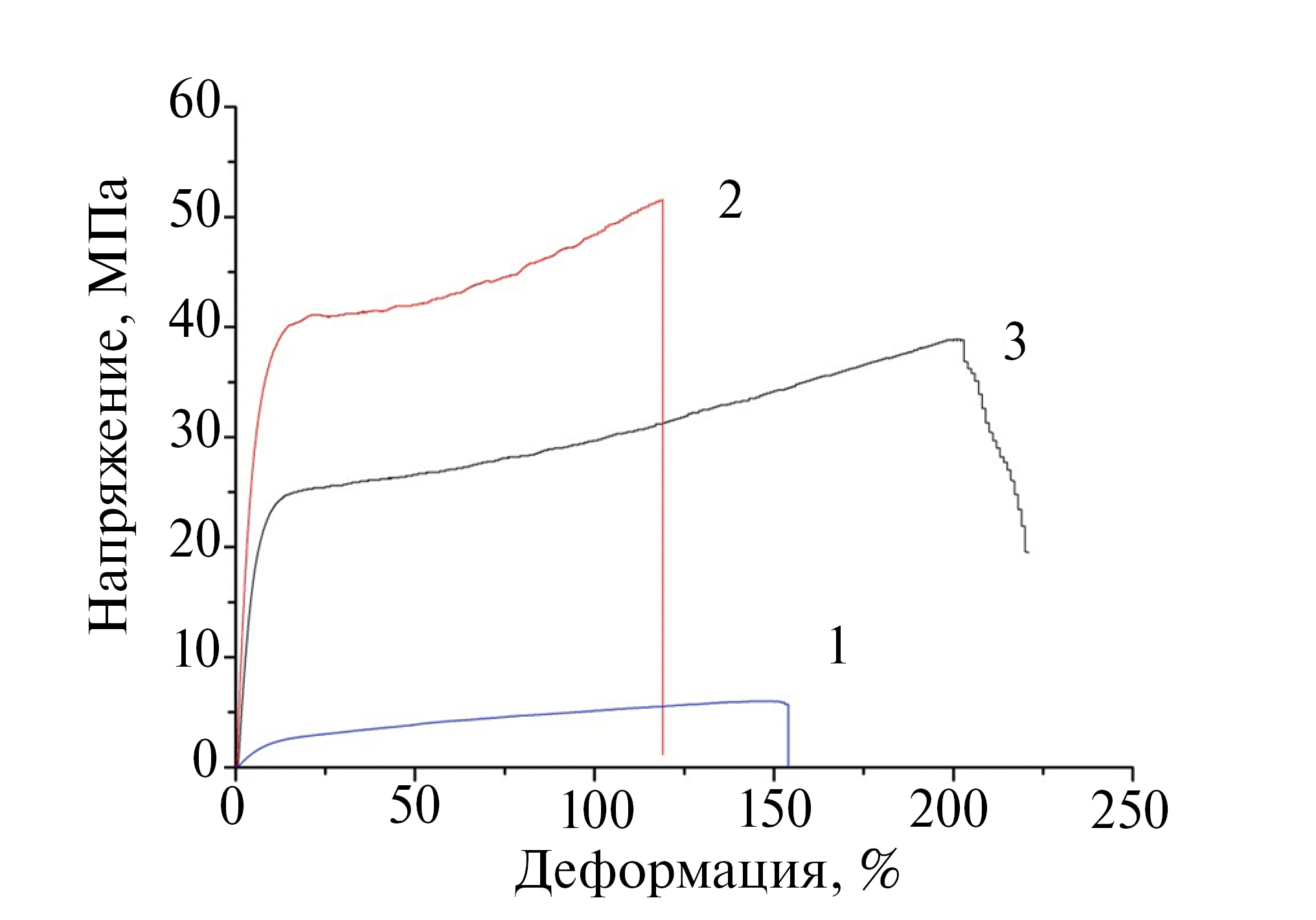 Рис. 4. Кривые напряжения-деформации. Nafion-0 (1), Nafion-3.8 (2), Nafion-6.7 (3)