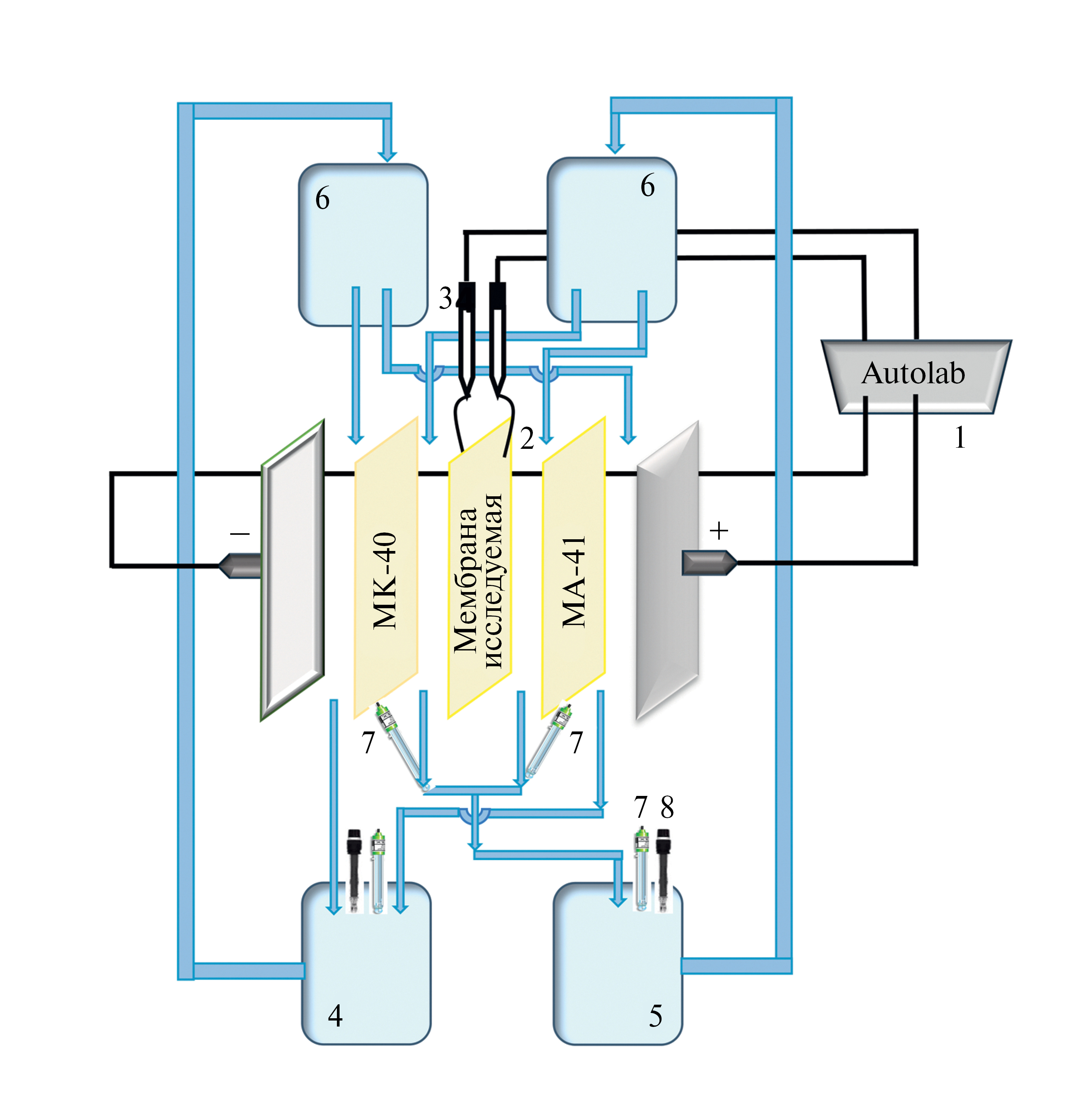 Рис. 1. Схема установки для получения вольт-амперных характеристик исследуемых мембран: 1 – электрохимическая станция Autolab PGStat-302 N для задания тока и измерения скачка потенциала; 2 – капилляры Луггина, соединенные с микроемкостями, в которые помещены закрытые хлорсеребряные электроды (3); 4 – емкость с 0.02 M раствором NaCl, циркулирующим в электродных камерах; 5 – емкость с 0.02 M раствором NaCl, циркулирующим в камерах обессоливания (КО) и концентрирования (КК); 6 – буферные емкости для смягчения пульсаций перистальтического многоканального насоса Heidolph Pumpdrive 5001 (не показан); 7 – комбинированные электроды для измерения pH, соединенные с pH метрами Эксперт 001; 8 – кондуктометрические погружные ячейки, соединенные кондуктометрами Эксперт 002
