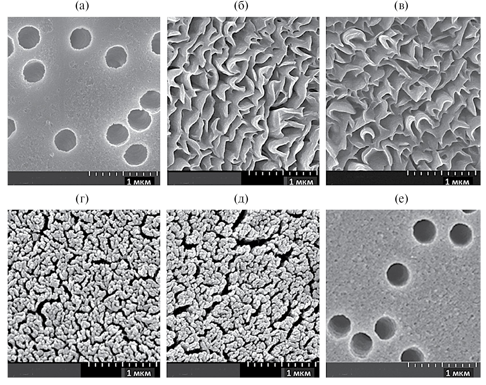 Рис. 1. Изображения поверхностного слоя, полученные методом РЭМ, исходной ПЭТФ ТМ с диаметром пор 250 нм (а), мембран с покрытием из СВМПЭ толщиной 300 (б) и 500 нм (в); мембран с покрытием из ПТФЭ толщиной 300 (г) и 500 нм (д); обратная сторона модифицированной мембраны (е).