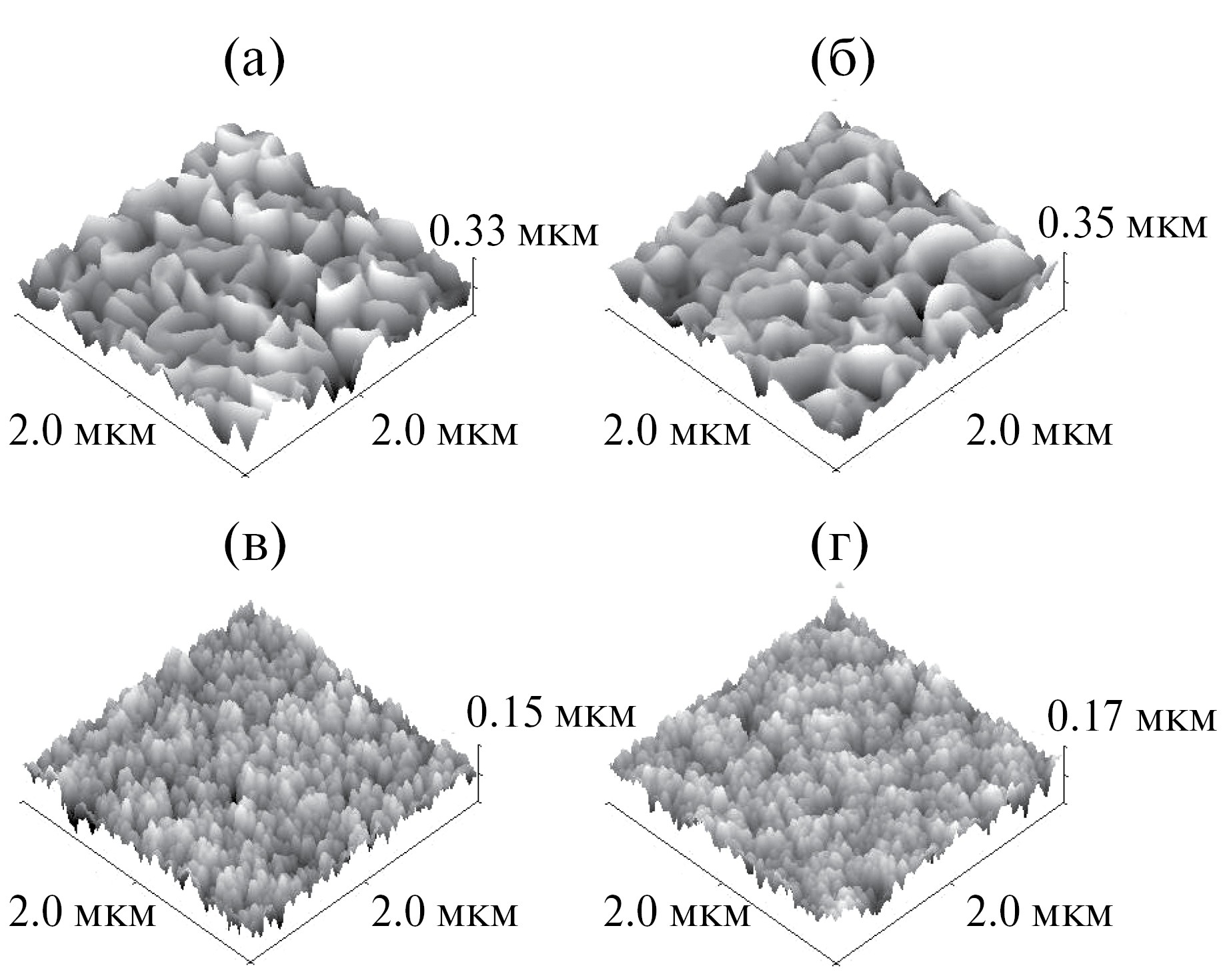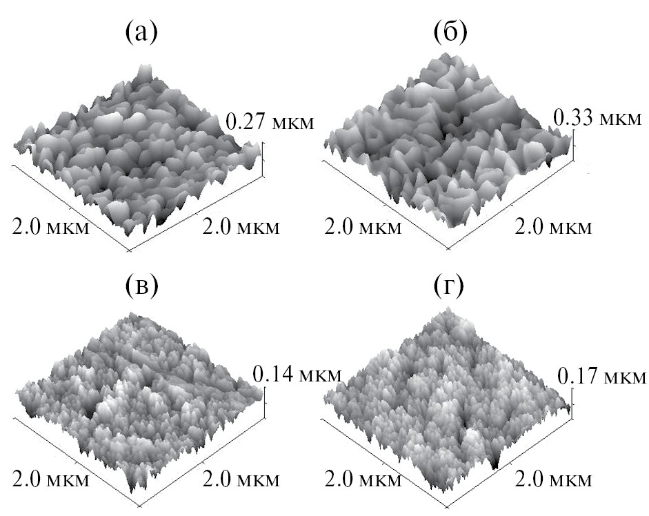 Поверхностная шероховатость, нм (площадь сканирования 2 × 2 мкм2) | 50.0 | 39.3 | 50.4 | 16.3 | 20.1 |