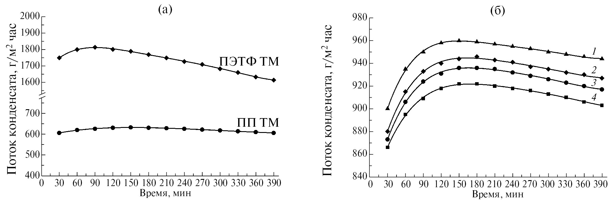 Рис. 3. Изменение потока конденсата во времени в процессе мембранной дистилляции исходных трековых мембран из ПЭТФ и ПП (а) и композиционных мембран с покрытием из ПТФЭ толщиной 300 (1) и 500 нм (2), с покрытием из СВМПЭ толщиной 300 (3) и 500 нм (4), осажденным методом ЭЛД (б)