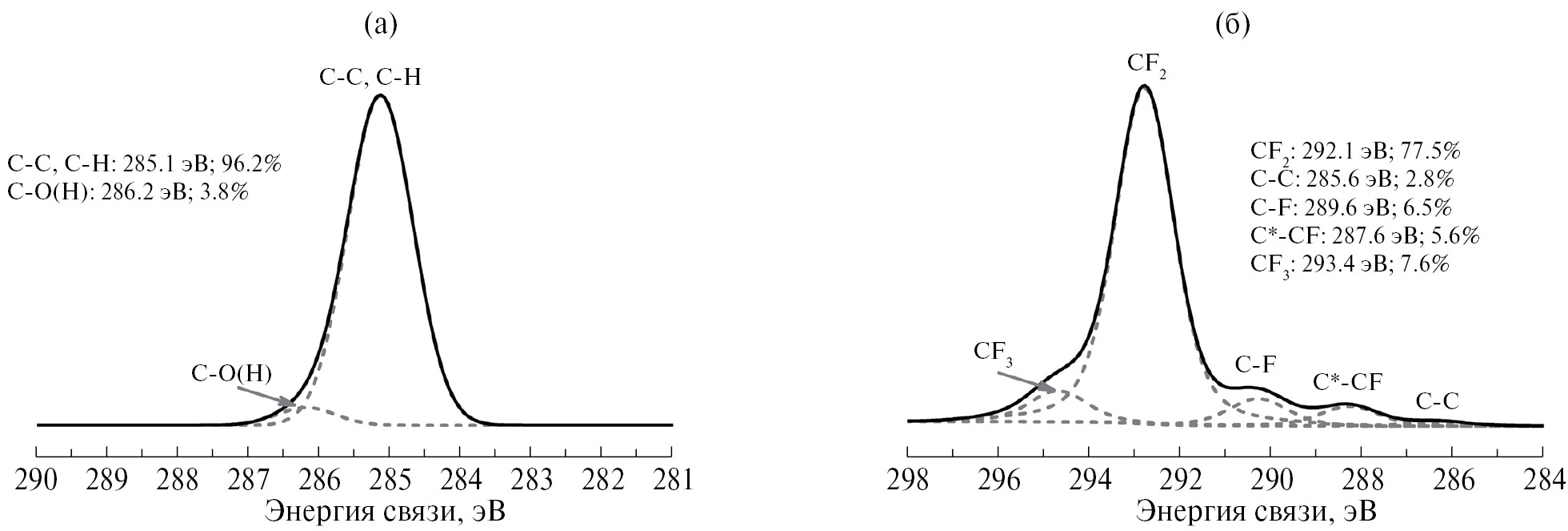 Рис. 6. Спектры РФЭС атомов С1s покрытий из СВМПЭ (а) и ПТФЭ (б) толщиной 500 нм, осажденных методом электронно-лучевого диспергирования; измерение произведено после хранения композиционных мембран в течение 5 лет.