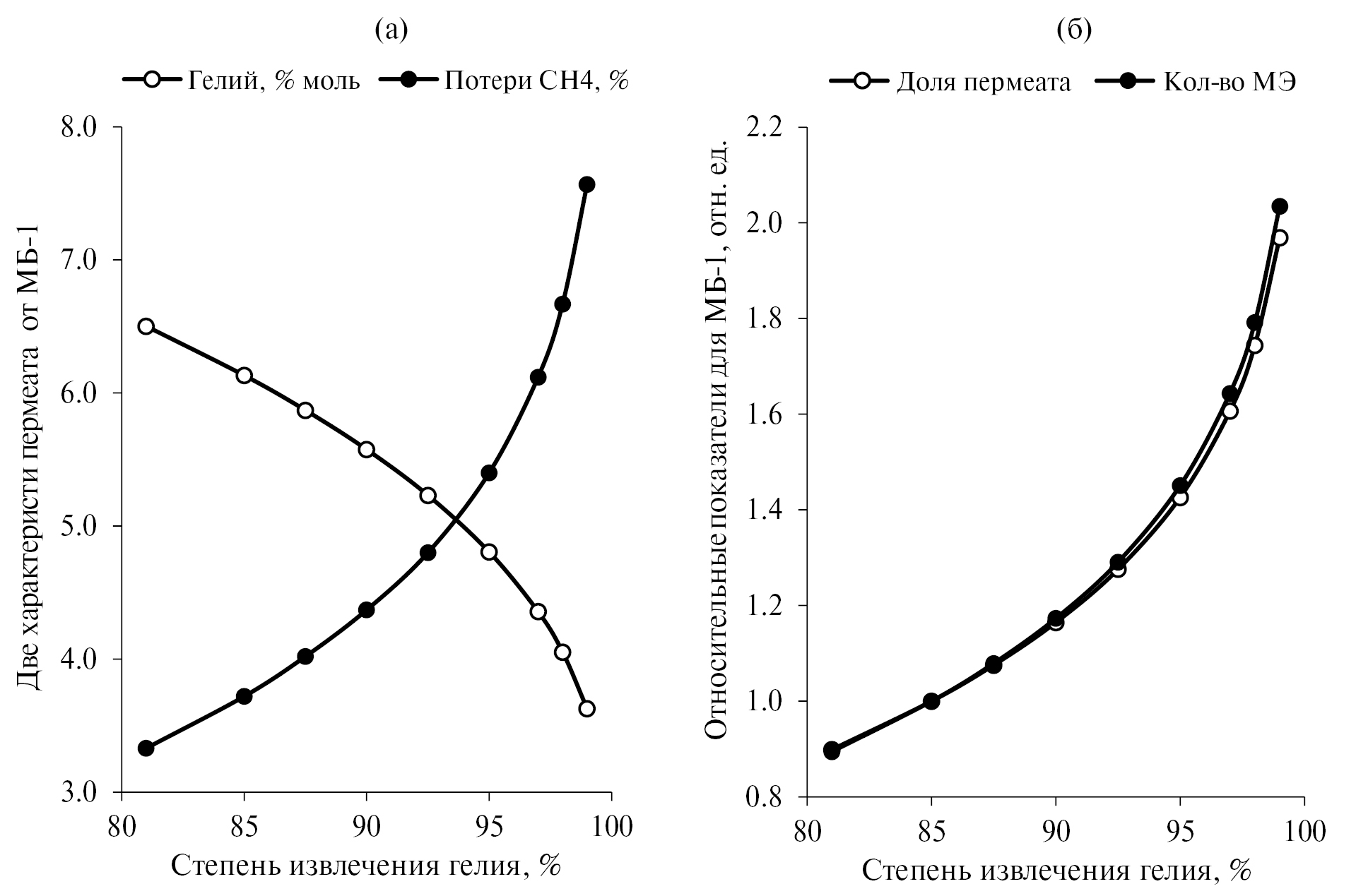 Рис. 2. Наиболее характерные зависимости последствий повышенных требований к степени извлечения гелия для МБ-1 на первой ступени установки, где а) график снижения концентрации извлеченного гелия в потоке пермеата МБ-1 за счет увеличения доли проникшего/потерянного метана при требовании увеличить степень извлечения гелия более 90% и, тем более, при требовании – более 95%; б) графики относительных показателей (нормировано на значения при 85% степени извлечения гелия) в увеличении расхода пермеата МБ-1 и в увеличении капитальных вложений по требуемому количеству МЭ.