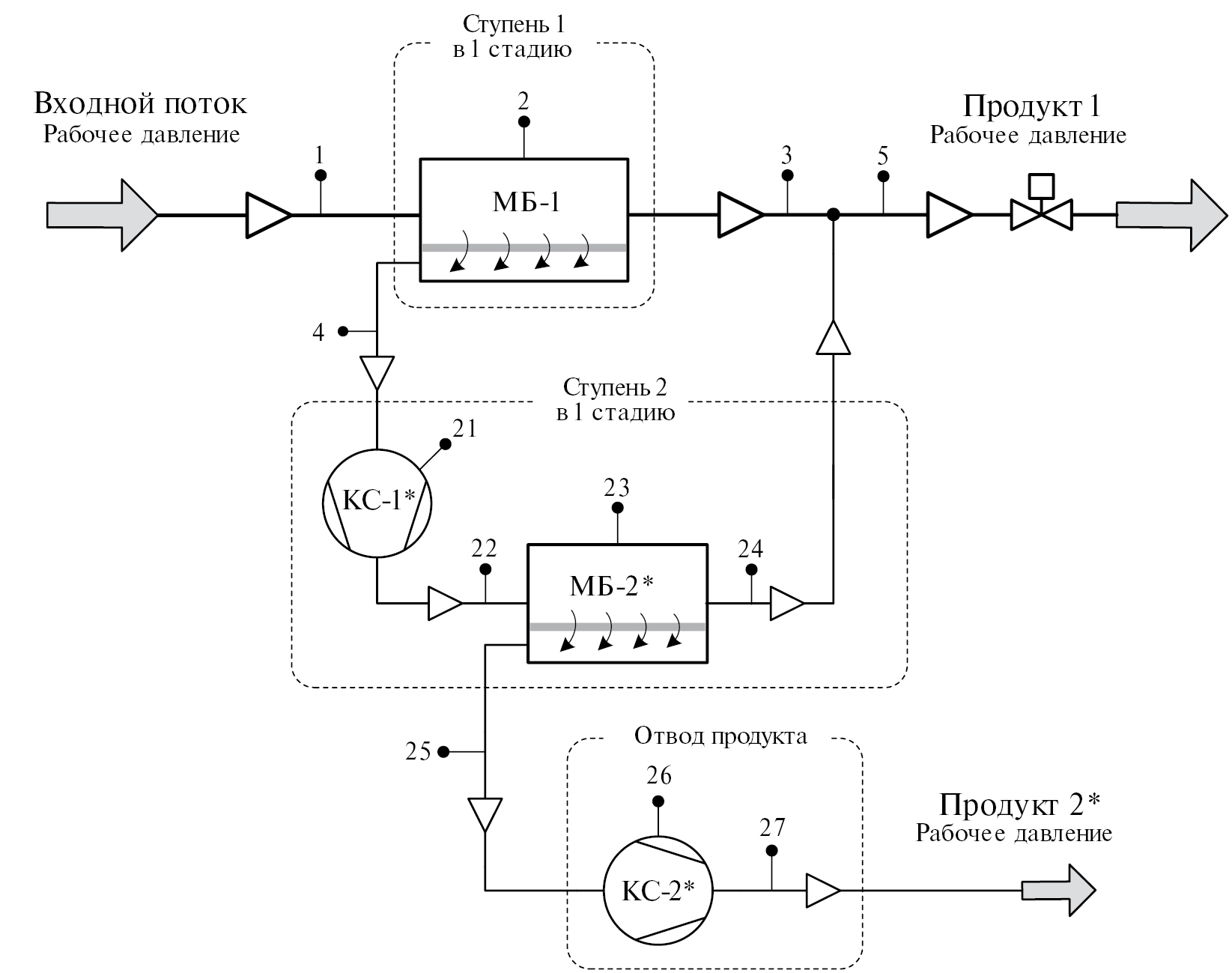 Рис. 1. Принципиальная двухступенчатая схема мембранного извлечения гелия и его концентрирования в соответствии с российским патентом [8], где 1 – трубопровод для подачи ГПГ при рабочем давлении, удовлетворяющий ТУ СТО Газпром 089-2010 и, прошедший тщательную фильтрацию от механических примесей; 2 – одностадийный мембранный блок МБ-1 из параллельно работающих МЭ; 3 – трубопровод отвода ретентата от МБ-1 с малым остаточным содержанием гелия; 4 – трубопровод пермеата низкого давления от МБ-1 с извлеченными газами; 5 – трубопровод для отвода объединенных двух газовых потоков (3 и 13) при рабочем давлении (от первой и второй ступеней) и с малым остаточным содержанием гелия как один из конечных результатов мембранного газоразделения – Продукт 1; 6 – трубопровод подачи газа на вход КС-1, после объединения двух пермеатных потоков низкого давления от МБ-1 и от МБ-3 с целью их сжатия до рабочего давления; 7 – многоступенчатая компрессорная станция КС-1 со вспомогательным оборудованием; 8 – трубопровод отвода сжатого потока газа из КС-1 для последующего газоразделения; 9 – одностадийный мембранный блок МБ-2 для реализации первой стадии газоразделения на второй ступени мембранной установки; 10 – трубопровод отвода ретентата от МБ-2 и его подачи в МБ-3 для последующей стадии газоразделения в составе второй ступени; 11 – трубопровод отвода пермеата от МБ-2 для формирования Продукта 2, который можно условно назвать “гелиевым концентратом”; 12 – одностадийный мембранный блок МБ-3 для реализации финальной стадии газоразделения для достижения требуемых итоговых результатов от второй ступени; 13 – трубопровод отвода ретентата от МБ-3 с малым остаточным содержанием гелия с его концентрацией, как и в ретентате от МБ-1 для объединения этих двух потоков; 14 – трубопровод отвода циркулирующего пермеата низкого давления от МБ-3 для последующей подачи совместно с пермеатом от МБ-1 на вход КС-1; 15 – многоступенчатая компрессорная станция КС-2 с целью восстановления начального рабочего давления у пермеатного потока от МБ-2 для корректной оценки суммарной удельной энергоемкости всех процессов в двухступенчатой мембранной установке; 16 – трубопровод отвода гелиевого концентрата с рабочим давлением, как второго конечного продукта – Продукт 2 для принятия решения по его дальнейшему использованию.