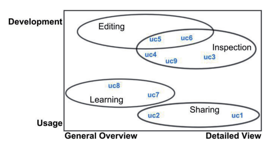 Так, например, согласно [22] можно выделить четыре варианта использования визуализации онтологий: редактирование, обучение, проверка и совместное использование. На рисунке 2 показана группировка девяти распространённых вариантов использования визуализации онтологии: создание иллюстраций отдельных частей онтологии (uc1) или её общего содержания (uc2); обнаружение структурных ошибок (uc3); проверка адекватности модели (насколько хорошо онтология покрывает свою ПрО) (uc4); построение новой онтологии (uc5); адаптация существующей онтологии, например, путём добавления сущностей или её настройки на конкретную цель (uc6); анализ онтологии для создания или аннотирования данных с её помощью (uc7); решение о пригодности онтологии для конкретной цели (uc8); анализ онтологии с целью сопоставления её с другой онтологией (uc9). Категории и варианты использования могут быть расположены в двухмерном пространстве, как показано на рисунке 2. Одно измерение (Development) определяет активно ли пользователь разрабатывает онтологию или только использует её. Другое (Detailed) кодирует требуемый уровень детализации, т.е. достаточно ли обзора (например, иерархии классов) или необходимо подробное представление (например, аксиомы, относящиеся к классу) [21].