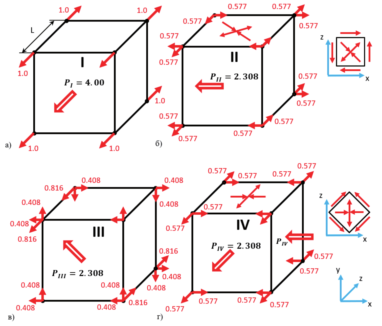 Для исследования прочностных характеристик сформированных структур и конструкций рассматривались четыре случая нагружения внешними силами в узлах представительного объёма, показанные на рисунке 7 и обозначенные римскими цифрами.