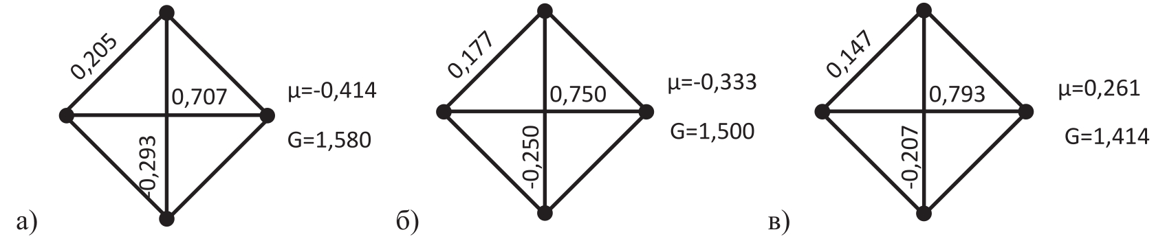 - Вычисление отношений потребных по прочности объёмов Vпр каждой из рассмотренных к минимальному объёму V4 = 4,0 конструкции из четырёх стержней, нагруженных только растяжением (рисунок 7а), даёт величины в среднем близкие к 6,0 (таблицы 2-4). Откуда следует, что хаотическое армирование в объёмных КМ позволяет реализовать не более 17% прочности армирующего материала. В примере раздела 2 соответствующее соотношение составило 3,0, которое хорошо известно для слоистых мембранных композитов и доказывается теоретически. Полученное в данной работе соотношение 6,0, по-видимому, соответствует теоретическому.
