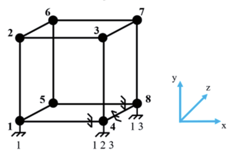 I случай нагружения четырьмя узловыми силами соответствует растяжению сплошного тела 1-8 в направлении оси z (рисунок 7а) с напряжением Н/м2 и равнодействующей характерной нагрузкой Н, приложенной к грани 1234.