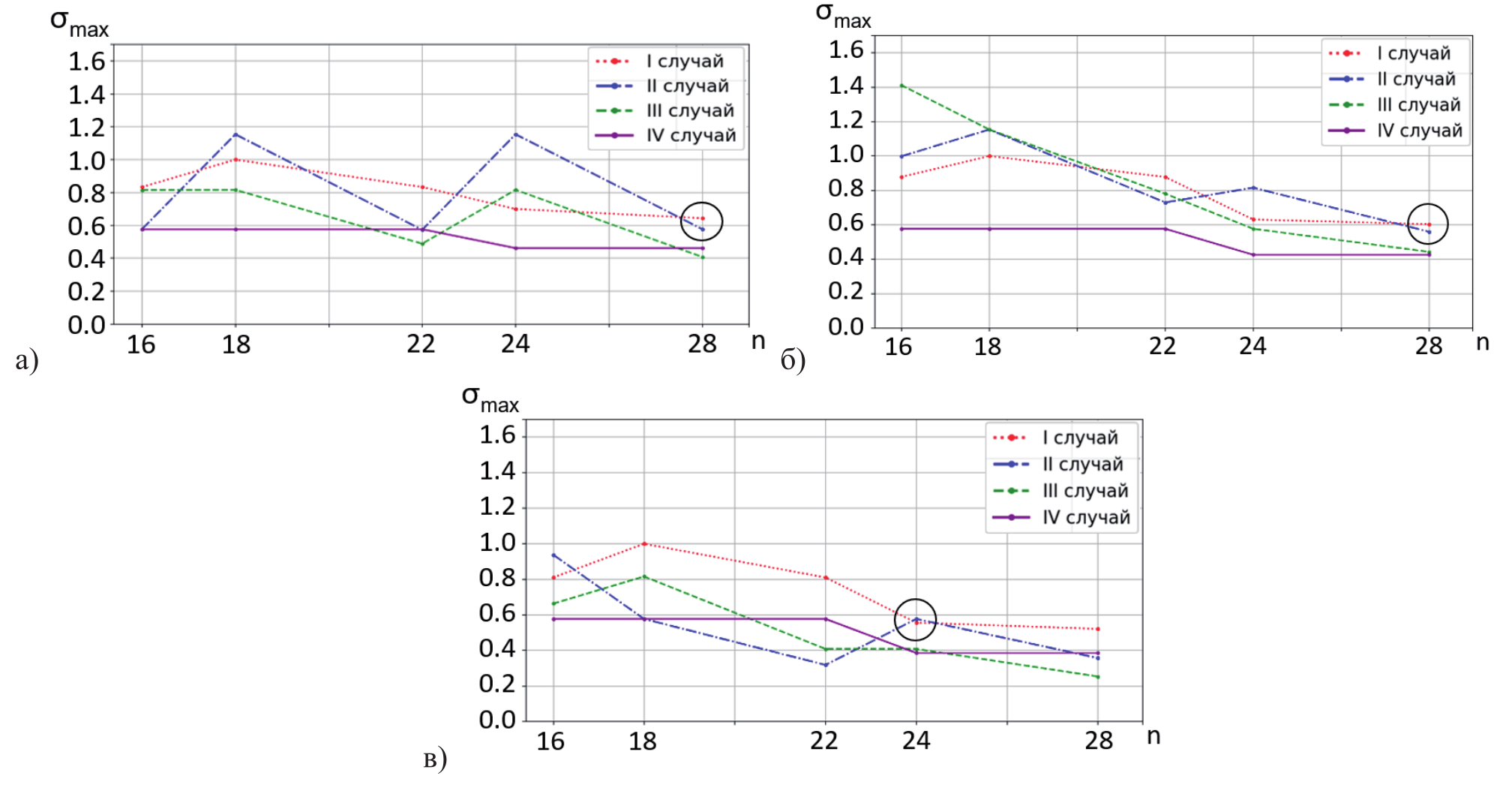 - Можно видеть (рисунок 8) практически полное совпадение максимальных напряжений (отмеченное кружками) в конструкциях «24» и «28» в случаях нагружения I и II. С точки зрения прочности сформированные стержневые конструкции ведут себя как изотропный материал, соответствующий критерию Губера-Мизеса.