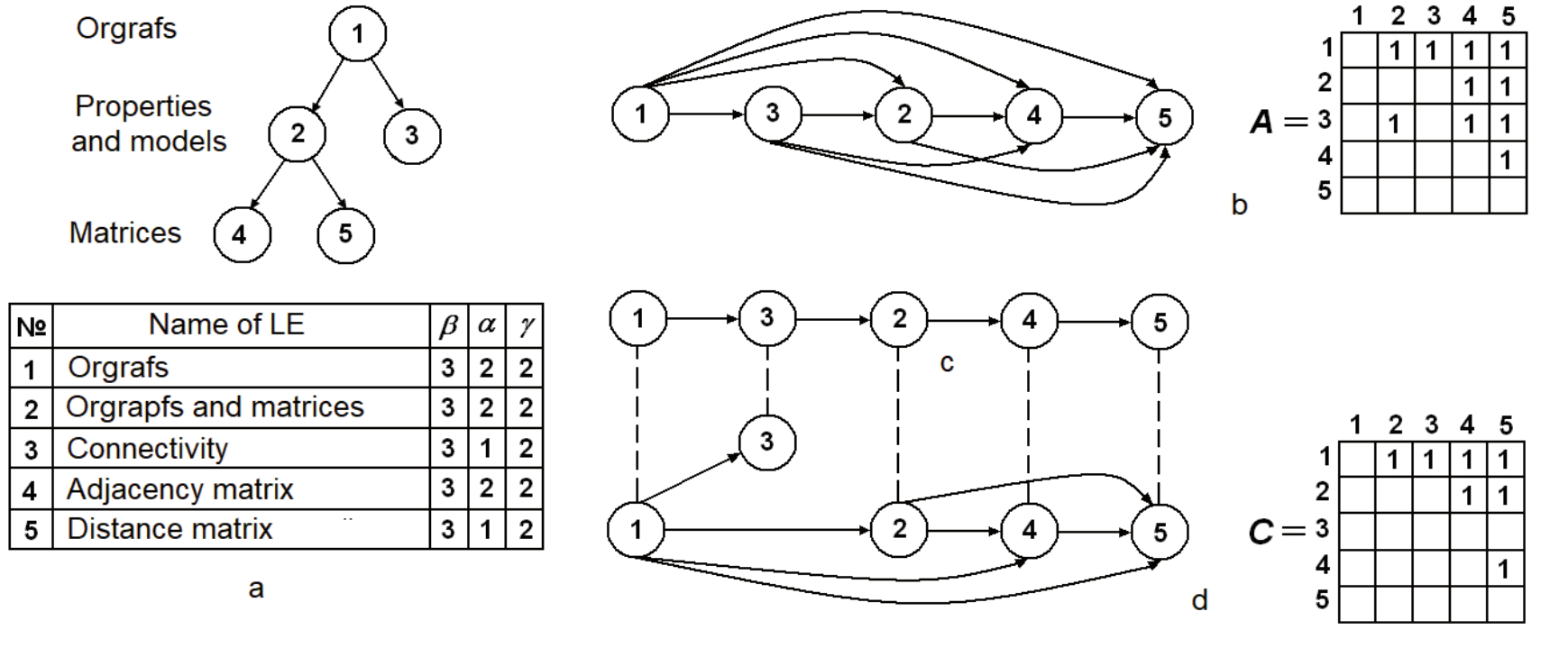 Figure 1 – An example of content and navigation models for a fragment of the theory of orgraphs from the book [21]: a – content model; b – orgraph and matrix of relations of order of LE; c – the sequence of learning the LE; d – orgraph and connectivity matrix of LE