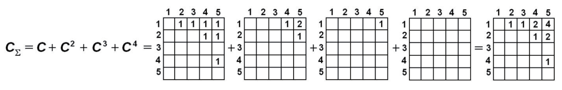 For the above example (see Figure 1, d), the matrices corresponding to properties 3 and 4 are shown in Figure 2. It follows that, for example, from vertex 1 to vertex 5 (see Figure 1, d) there are four paths (one simple path of unit length, two paths of length 2 and one path of length 3).