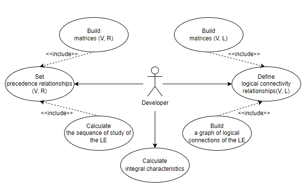According to the adjacency matrix, it is possible to construct a corresponding orgraph, on which it is possible to more clearly trace the logical connections in the MN. At the same time, it is advisable to build this orgraph from left to right, while maintaining the previously defined sequence of study (see Figure 1, d). It is convenient to place this orgraph under the list of the follow-up to the study of the LE, while maintaining the order of study of the educational material indicated in this list.