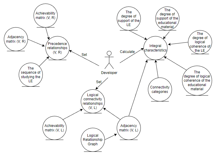 However, the content model does not answer two important questions of EC design: 1) what should be the didactically rational sequence of studying the EC in the course being created; 2) what logical connections should be established between individual LEs in order to ensure, for example, a purposeful "rollback" from the studied LE to any previously studied fragment of educational material, where the initial concepts for the LE under consideration are explained, bypassing the linear chain of intermediate LEs. In [18] an approach to solving these issues is proposed, based on the concept of a model navigation of EC. This concept includes a set of matrices of relations of order and logical coherence of the LE and the corresponding orgraphs of the sequence of study and logical coherence of the LE.