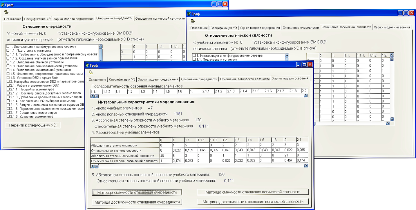 The algorithms discussed above make it possible to automate the process of MN preparation in instrumental authoring environments [20]. At the same time, the previously prepared set of the LE course is exported from the Content Model computer program [19]. Further, the developer of the EC in a dialogue with the computer program Navigation Model determines the relationship of priority and logical connectivity of the LE. At the same time, the computer program controls the correctness of this process, forms matrices of the relationship of priority and logical coherence, determines the sequence of navigation the LE, calculates the integral characteristics of the MN of the course (Figures 3-5)[4]. Screen fragments shown in Figures 5 and 6 as examples demonstrate the operation of the program Navigation Model in Russian.