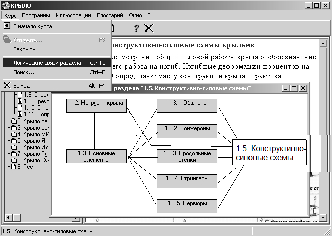 The relationship of logical connectivity in the EC navigation model. The logical coherence relation of the navigation model is an effective mechanism to help students navigate the EC. In particular, during the viewing of the EC, using fragments of the graph of logical connections of the LE, it is possible to purposefully return (recall) to the previously studied educational elements. Thus, Figure 6 shows an example of a fragment of the graph of logical connectivity of the EC for the design of aircraft [22]. Using this snippet, you can, for example, return from Learning Item 1.5 to View Learning Item 1.2 without viewing a series of intermediate Learning Items numbered 1.3.