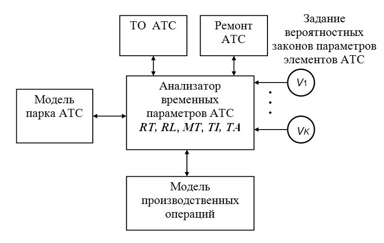 Главный модуль – анализатор основных временных параметров ТС в соответствии с выражением (1). В его функции входит отсчёт модельного времени наработки АТС, определение периодов до ТО, обработка запросов на события, появление которых определяется вероятностными законами V1,…,VK.