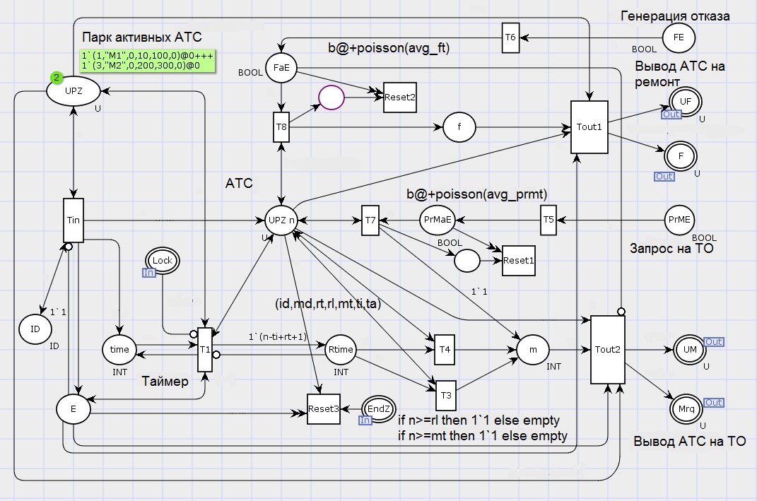 Для моделирования случайных процессов в CPN Tools предусмотрено объявление выражений, приписанных к позициям, дугам или переходам сети. С помощью таких выражений задаются законы распределения вероятностей. На рисунке 5 на выходных дугах переходов Т5 и Т6 формируются последовательности маркеров в соответствии с пуассоновским законом (сети Петри позволяют имитировать события с различными законами распределения). В структуре СППР (рисунок 2) имеется блок анализа и формирования стохастических моделей для основных параметров АТС, а также для событий типа «отказ», «дефект», «запрос на обслуживание». Этот блок используется коллективом экспертов для коррекции НЦД и установки различных сценариев и режимов эксплуатации АТС.