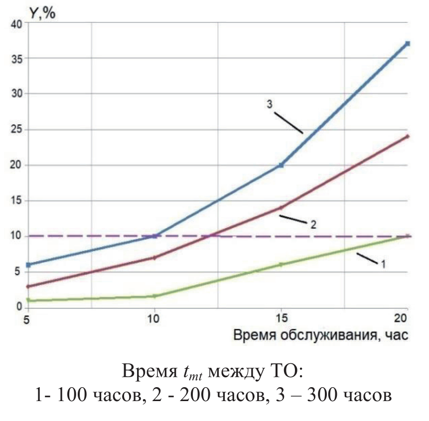 На рисунке 6 показаны зависимости коэффициента Y от длительности выполнения ТО и времени tmt до планового ТО по расписанию при распределении событий отказов оборудования АТС по пуассоновскому закону с интенсивностью λ = 0.1×10-3. Допустимое значение коэффициента задержки устанавливалось равным 10%. Видно, что увеличение периода tmt между плановым обслуживанием приводит к увеличению срока выполнения заданий, так как повышается вероятность отказов оборудования АТС.
