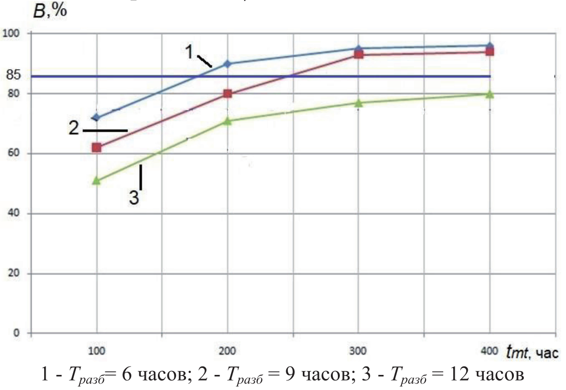 Рассчитывался коэффициент B использования автомобиля B=tr/tс, где tr – время эксплуатации автомобиля с грузом, tc - общее время эксплуатации, включающее ТОиР. Принимая допустимый уровень коэффициента использования, равный 85%, можно сформировать требования к режиму ТО автомобилей при различных стратегиях Tразб.