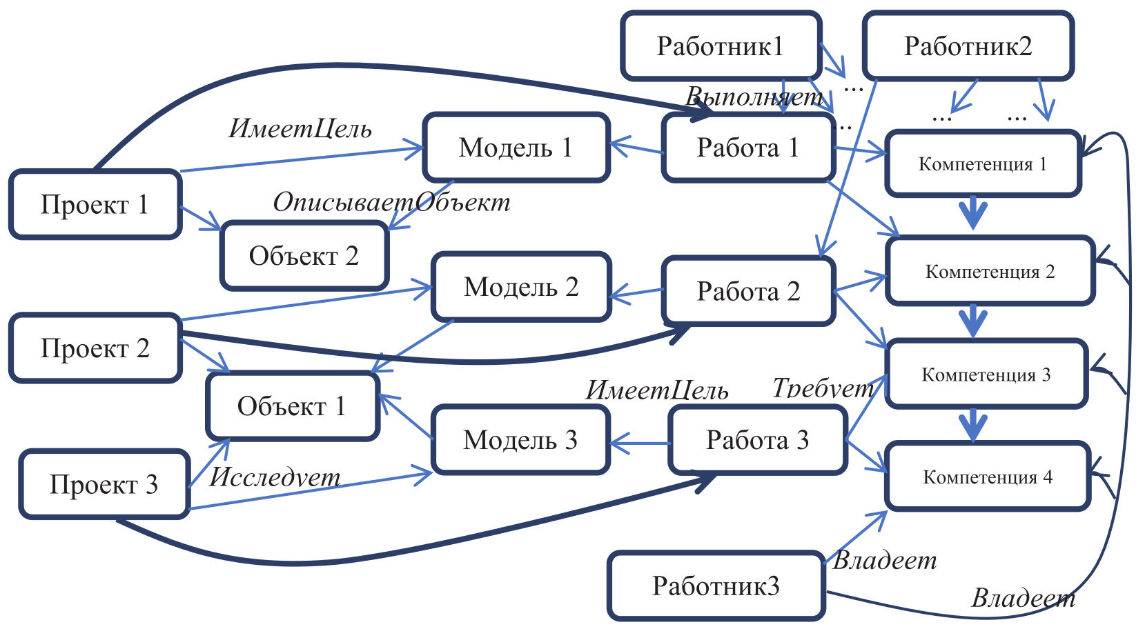 В качестве примера рассматривается задача определения возможных исполнителей работ по проекту, исходные данные, требования к исполнителям представлены в виде упрощённого орграфа с типизированными рёбрами (рисунок 2). Данный граф является подграфом онтографа проекта (рисунок 1) и в качестве вершин включает экземпляры объектов ПрО (классов онтологии), а именно таких классов, как Проект, Объект, МатематическаяМодель, Работник, РаботаПроекта, Компетенция.