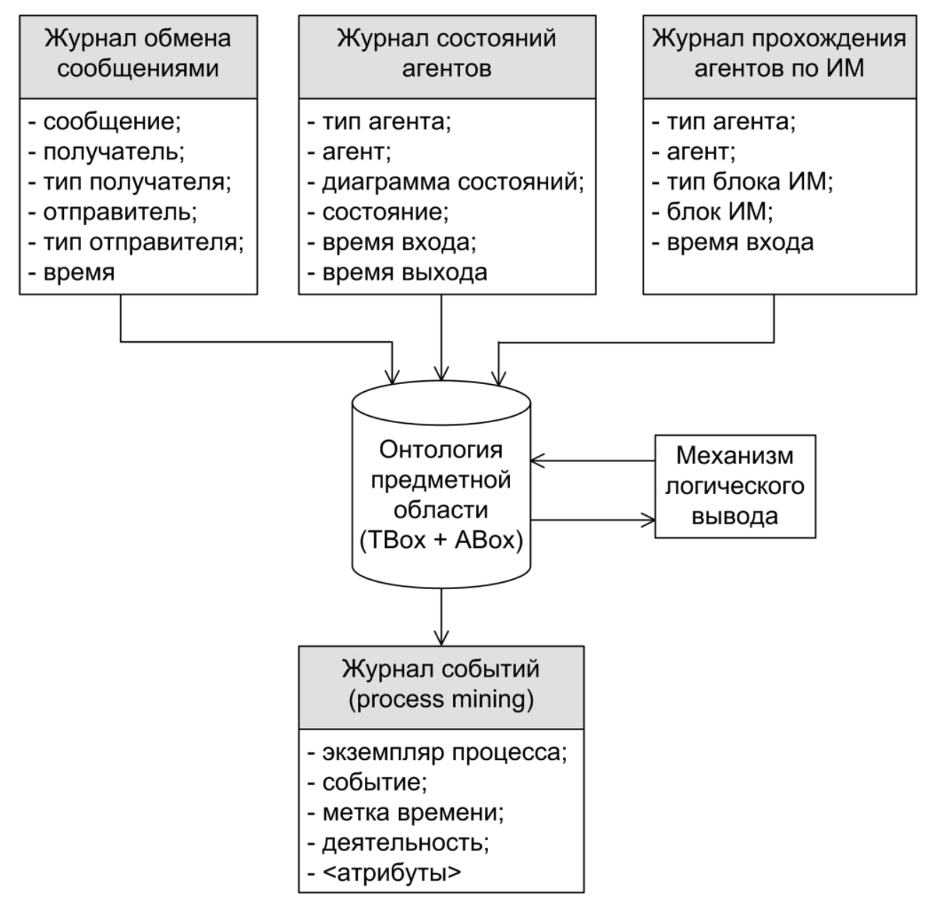Место онтологии событийных данных представлено на рисунке 1. В контексте ИАП журнал событий формируется на основе трёх видов журналов имитационного моделирования: обмена сообщениями; состояний агентов; прохождения агентов по ИМ.