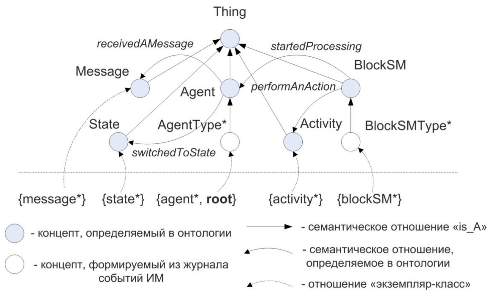 Обозначение класса с символом (*) поясняет факт наличия нескольких классов, количество которых заранее неизвестно. На рисунке 2 такими понятиями являются AgentType* и BlockSMType*. Индивиды понятий онтологии ПрО на рисунке представлены с помощью множеств {message*}, {state*}, {agent*, root}, {activity*} и {blockSM*}. Здесь индивид root выделен среди остальных индивидов как предопределённый (т.е. он присутствует в каждой ИМ в любом случае). Концепт «Агент» имеет вид: