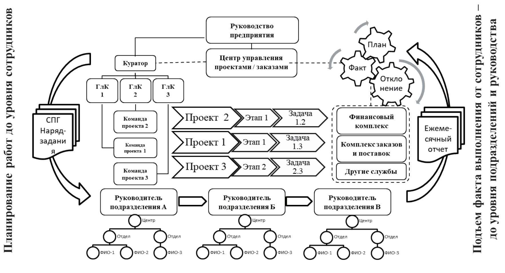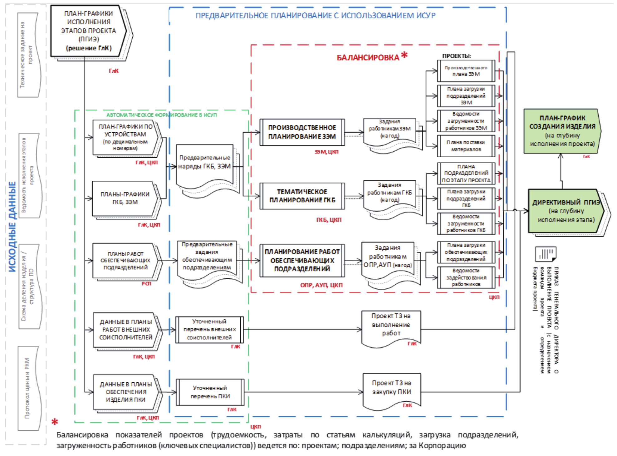 Новые проекты НИОКР разбиваются на этапы и декомпозируются на отдельные задачи с заданными трудоёмкостями, которые распределяются между основными и обслуживающими подразделениями и доводятся до уровня работников. Возникающие конфликты разрешаются путём переговоров и взаимных уступок, т.к. различные заказы конкурируют между собой в распределении ресурсов.