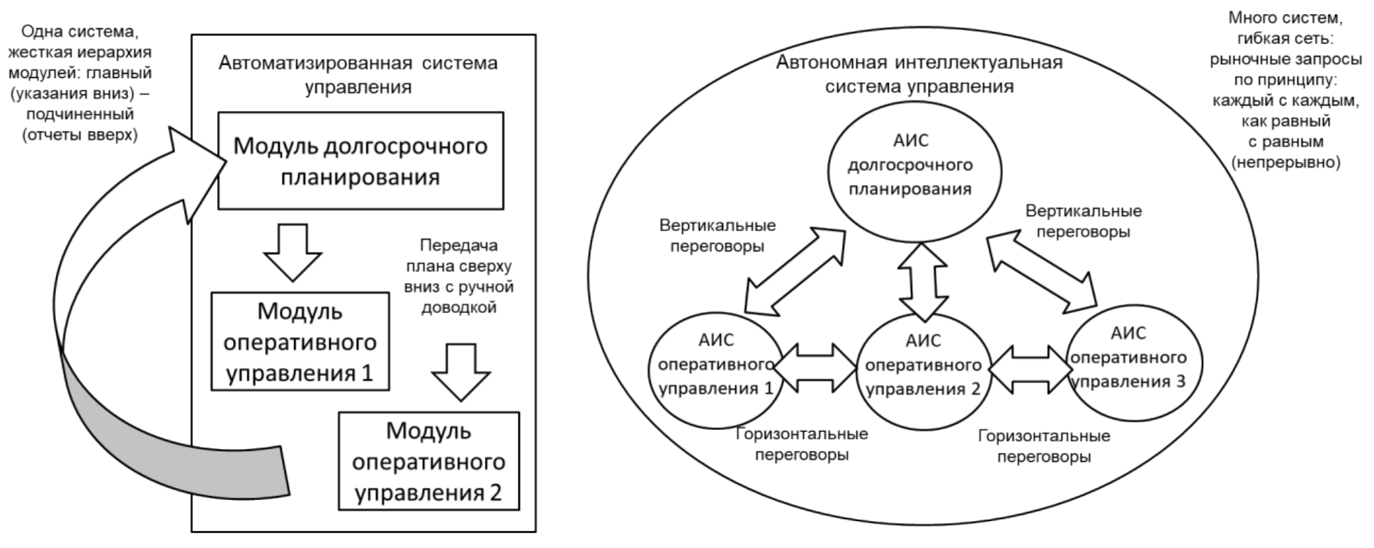 1 | Автоматизированная система, состоящая из набора модулей различного уровня, ориентированная на учётные функции | Автономная интеллектуальная система из набора таких же автономных систем каждого уровня, ориентированных на планирование и контроль |