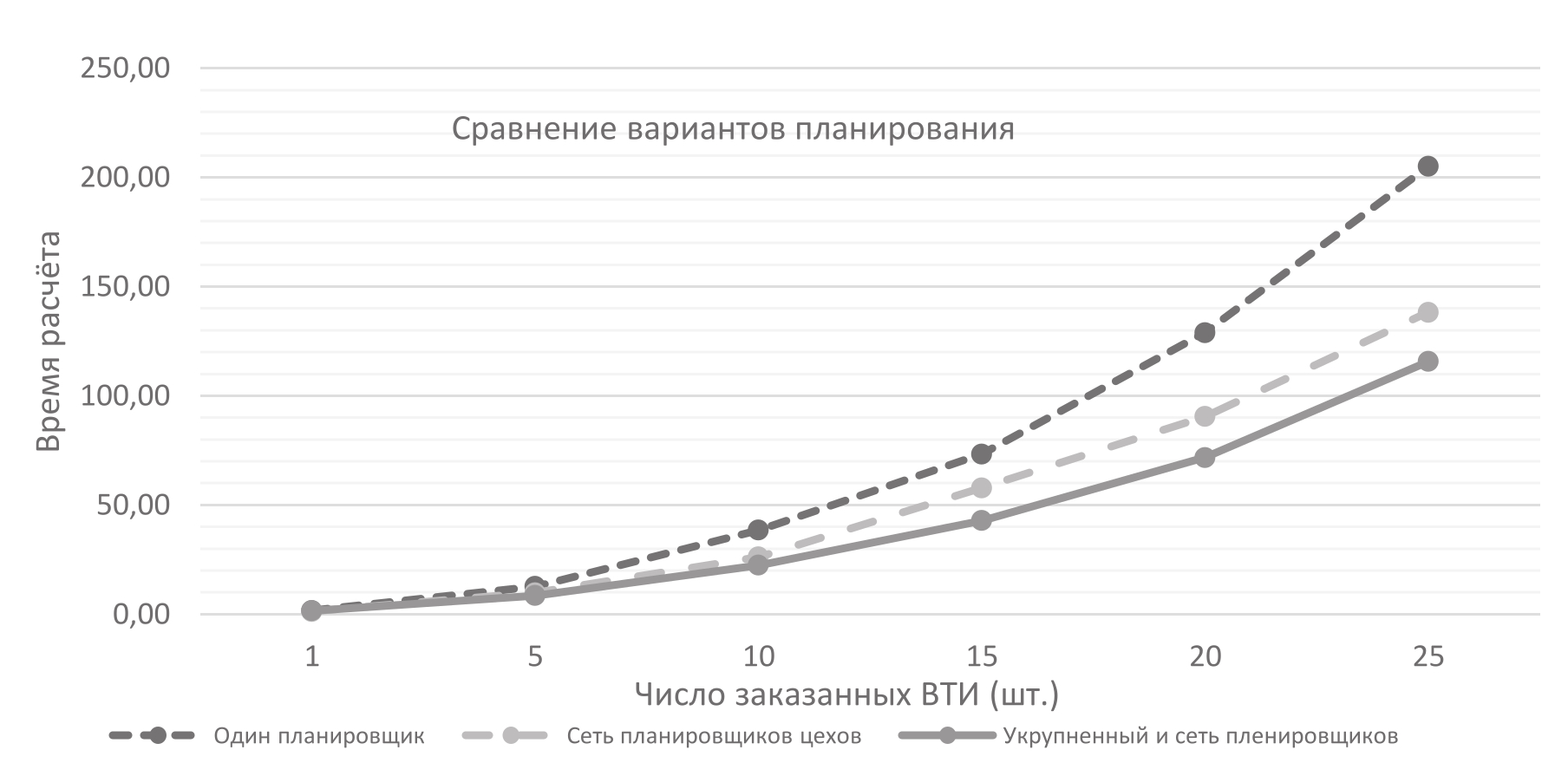 Применение многоуровневого распределённого планирования позволяет сократить время разработки и согласования оперативных планов цехов на 75% по сравнению с планированием без учёта вышестоящих планов и сокращает количество ресурсных конфликтов, выявляемых в производственном планировании, в 3-5 раз.