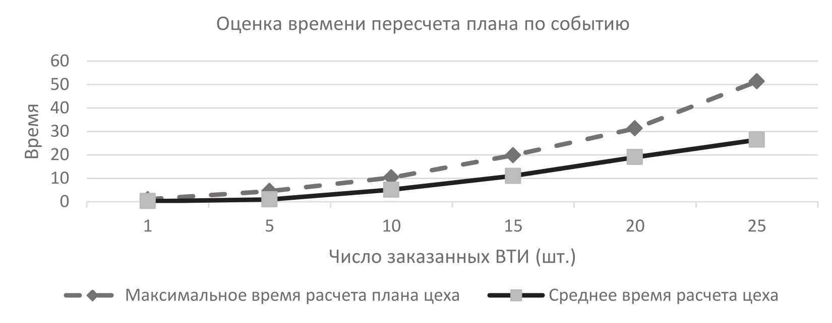 Рисунок 9 – Зависимость времени расчёта производственных планов от числа заказанных ВТИ