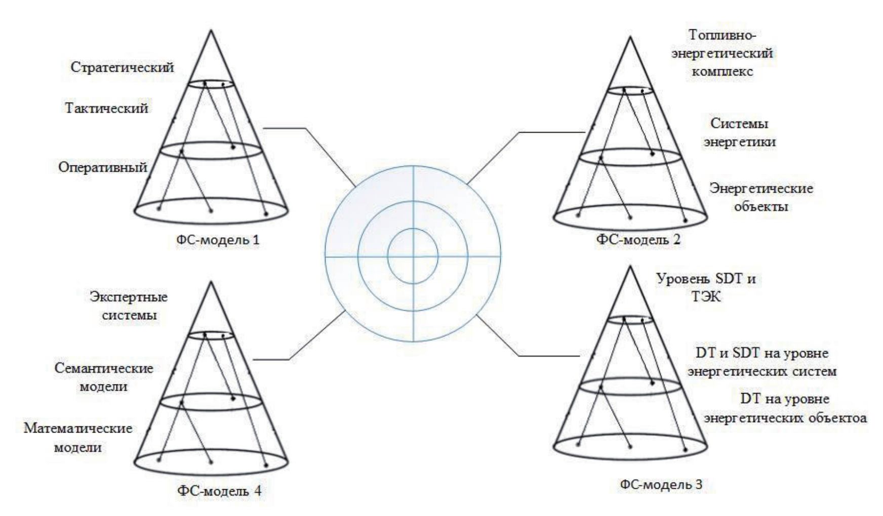 При построении онтологий используется фрактальный подход [33], где под фрактальностью понимается возможность использования одни и те же технологии построения для онтологий разного масштаба. Графически фрактальную стратифицированную модель (ФС-модель), описывающую информационное пространство, можно представить в виде набора вложенных сферических оболочек (страт или слоёв), где каждая страта (слой) объединяет информационные модели одного типа. На практике не работают со всем информационным пространством, а только с его частью (сектором), которую можно представить, например, в виде конуса. На рисунке 1 показана ФС-модель, в которой представлены конусы, описывающие четыре типа стратификации: 1) по типу управления (оперативное, тактическое, стратегическое); 2) по функциональным уровням построения ЦД (ТЭК, энергетические системы, объекты энергетики, где степень агрегации возрастает с каждым слоем); 3) по типам ЦД (УЦД на уровне ТЭК, ЦД и УЦД на уровне энергосистем, ЦД на уровне объекта); 4) по типам моделей (модели знаний в экспертных системах, семантические модели, ММ). Используется отображение между слоями (от любого слоя к каждому) [33].