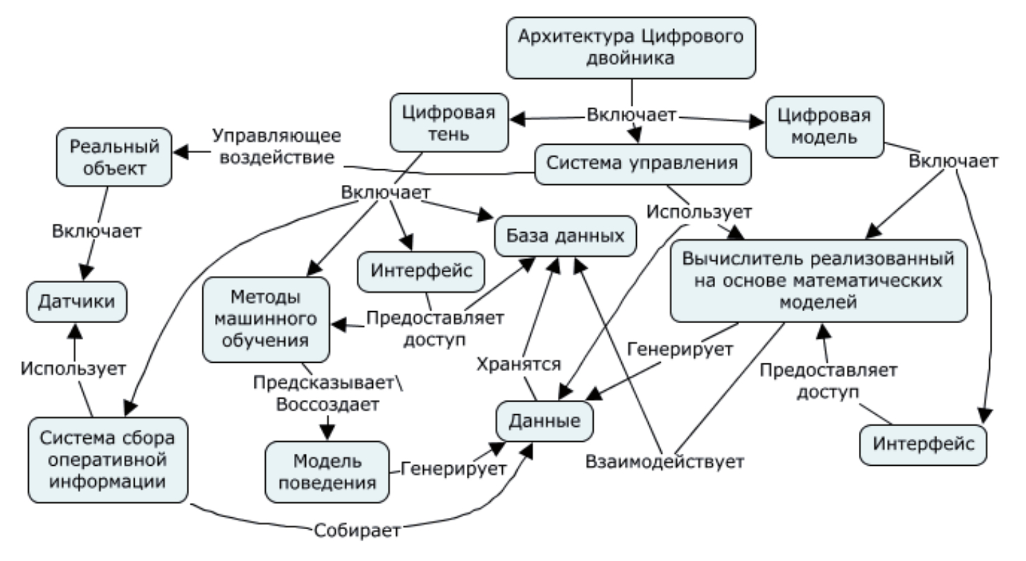 На рисунке 2 представлена онтология архитектуры ЦД солнечной электростанции, интегрирующая цифровую модель, цифровую тень, ММ, методы машинного обучения для прогнозирования погодных условий и др. Интеграция моделей осуществляется за счёт использования единого онтологического пространства знаний, в котором представлены отображения уровней систем, уровней управления, различных моделей и связей концептов в этих моделях. Использование онтологий на уровне проектирования ЦД позволило выявить основные информационные потоки, получаемые с объектов, формализовать основные факторы, которые необходимы для использования в ММ. На основе онтологического инжиниринга спроектированы БД, в которые поступают оперативные данные с датчиков, на основании этих данных строится цифровая модель.