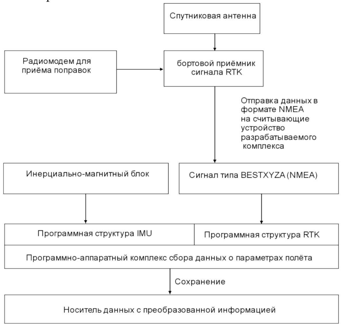 Для получения данных о положении ЛА в траекторной системе координат используется приёмник аппаратуры RTK (Real Time Kinematic – «кинематика реального времени») [10] работающий с навигационными спутниковыми системами (GPS, США; ГЛОНАСС, Россия; Бэйдоу, Китай) по протоколу Национальной ассоциации морской электроники (National Marine Electronics Association - NMEA), формирующий пакет с информацией о положении БПЛА и векторе его скорости.