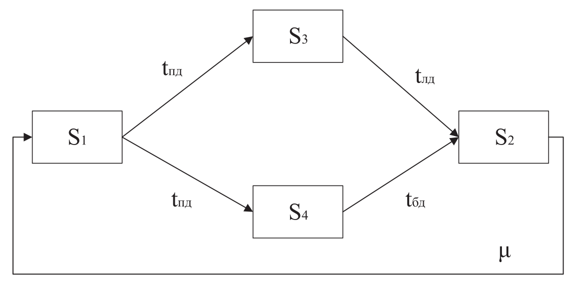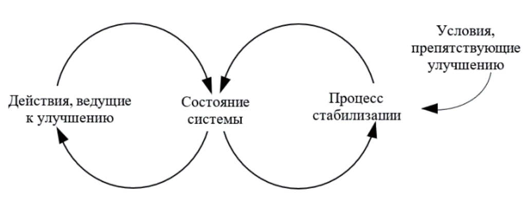 Контурная модель, представленная на рисунке 3, представляет собой стабилизирующий цикл. Характеристикой состояния ПС является вероятность безотказной работы/отказа.
