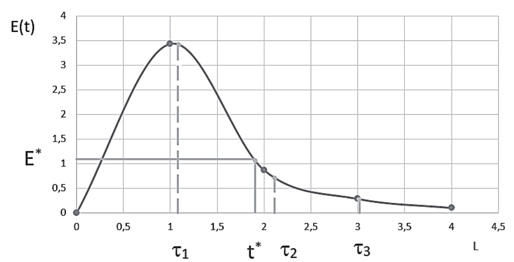 В таблице 1 приведены значения D(t), S(t), E(t), соответствующие разным отметкам времени τi. На рисунке 6 приведена графическая модель, характеризующая поведение E(t) и построенная на основе данных, представленных в таблице 1.
