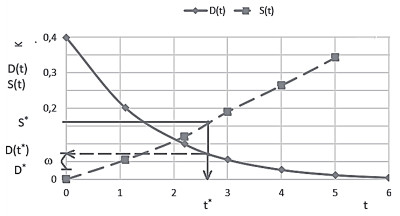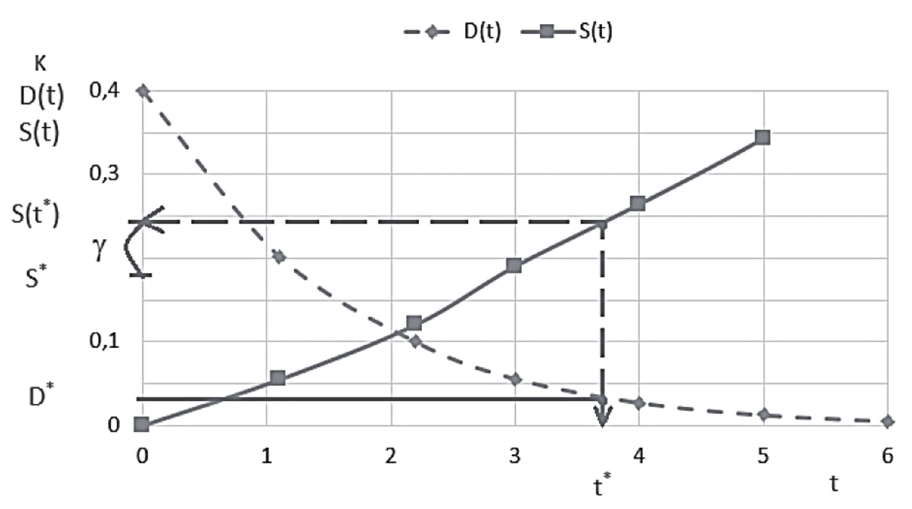 В примере постулированы зависимости D(t), S(t), описанные в примере 2. Заданному значению S* соответствует t*, представленное на рисунке 8. Этому значению t* соответствует показатель D(t*), указанный на оси ординат.