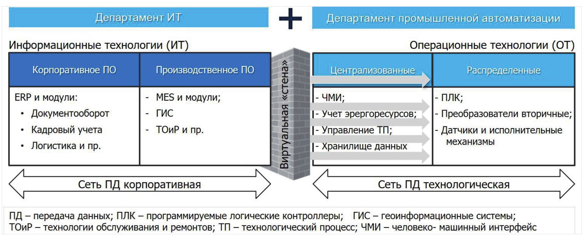 В настоящее время происходит взаимопроникновение («диффузия») ИТ ↔ ОТ, которая проявляется, с одной стороны, в применении ИТ-решений для проектирования архитектуры систем контроля и управления технологическим оборудованием, с другой – востребованностью в информационных системах производственно–корпоративного уровня данных, полученных от средств измерения в «сыром» или минимально обработанном виде.