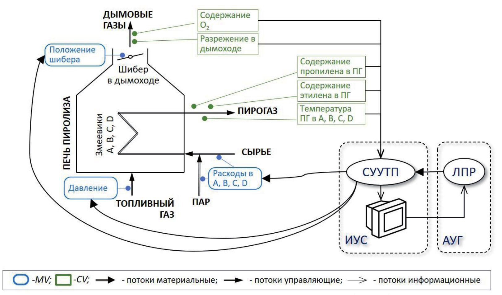 На рисунке 2 представлена типовая ПП, внутри которой находятся четыре змеевика A, B, C, D. Для ведения полнофункционального, иерархически и горизонтально взаимоувязанного, управления пиролизным комплексом используют наборы контролируемых (физически измеряемых) и управляемых (реализуемых) технологических переменных1: CV и MV (Таблица 1).
