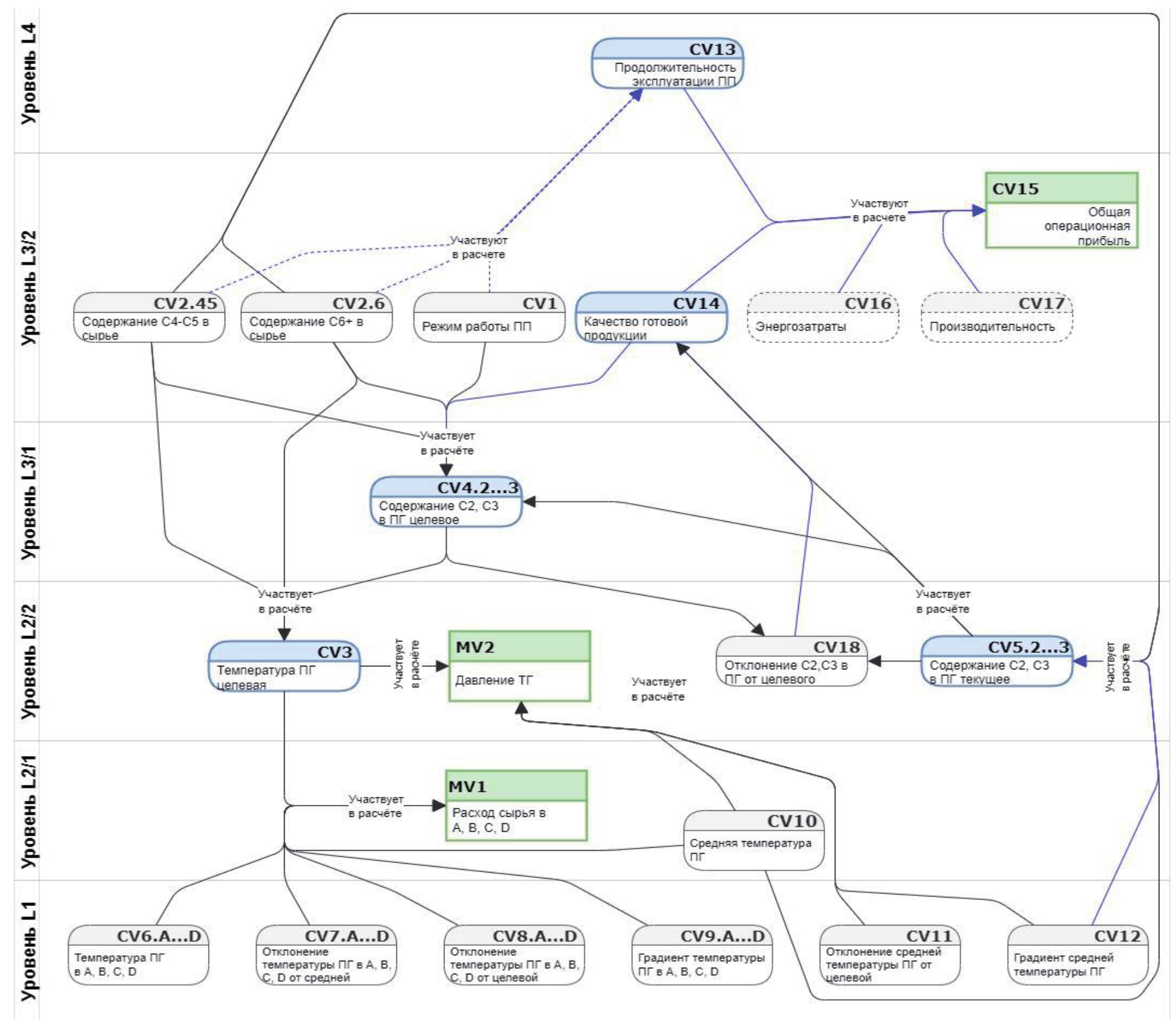 Ключевой особенностью разработанной ОМ являются её архитектура, отражающая иерархическую вложенность технологических (L2 и ниже) и производственных (L3 и выше) управляющих алгоритмов. Сформированная таким образом архитектура учитывает принадлежность реальных CV и MV (Таблица 1), как концептов, различным уровням производственно-управленческой иерархии L1…L4, а также включает разветвлённую семантику отношений между ними в виде предикатов «участвует в расчёте».