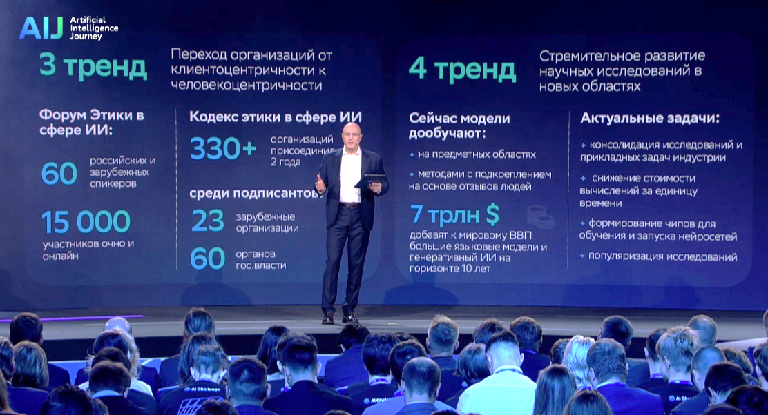 22–24 ноября 2023 года в Москве состоялась Международная конференция AI Journey 2023 - AIJ Путешествие в мир ИИ18. Это очередной успех организаторов AIJ, идущих семимильными шагами в неизведанные дали ИИ. Ключевые тренды развития ИИ на ближайшие пять лет наметил заместитель председателя правительства Российской Федерации Д.Н. Чернышенко. Президент России В.В. Путин, уже по традиции, осветил своим присутствием это мероприятие, выступив с речью и пообещав в ближайшее время подписать обновлённую стратегию развития ИИ в Российской Федерации.
