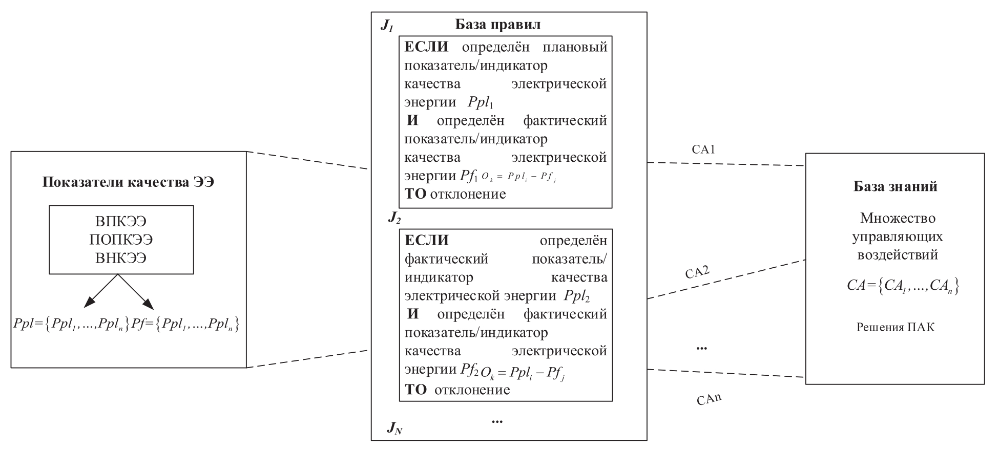 Модель представления знаний имеет вид: «ЕСЛИ условие, ТО действие». Под условием понимается некоторое предложение-образец, по которому осуществляется поиск в БЗ, а под действием – действия, выполняемые при успешном исходе поиска. При использовании модели БЗ состоит из набора правил [11]. БЗ и логические правила необходимы для поиска решения рассматриваемого процесса лицами принимающие решения (ЛПР) и оценки результатов поиска [12]. В основе логических правил лежит нечёткая логика, базирующаяся на понятии нечёткого множества. J1, …, JN – перекрёстки соединения «И» или «ИЛИ», означающие, что: все предшествующие процессы должны быть завершены и все следующие процессы должны быть запущены; или что одно или несколько исходных действий должны завершиться и одно или несколько конечных действий инициируется. Такие логические правила перекрёстков J1, …, JN целесообразно объединить в виде БЗ логических условий с учётом имеющегося опыта, накопленного в интеллектуальном ПАК. Таким образом, модель представления знаний в ПАК состоит из множества показателей/индикаторов плановых и множества фактических показателей/индикаторов, базы правил с логическими условиями, базы знаний с множеством управляющих воздействия (см. рисунок 3). Для любого показателя индикатора действует схема продукционных правил. Если определены и , то , где k – индекс маркированных показателей индикаторов, k=1,…,n.